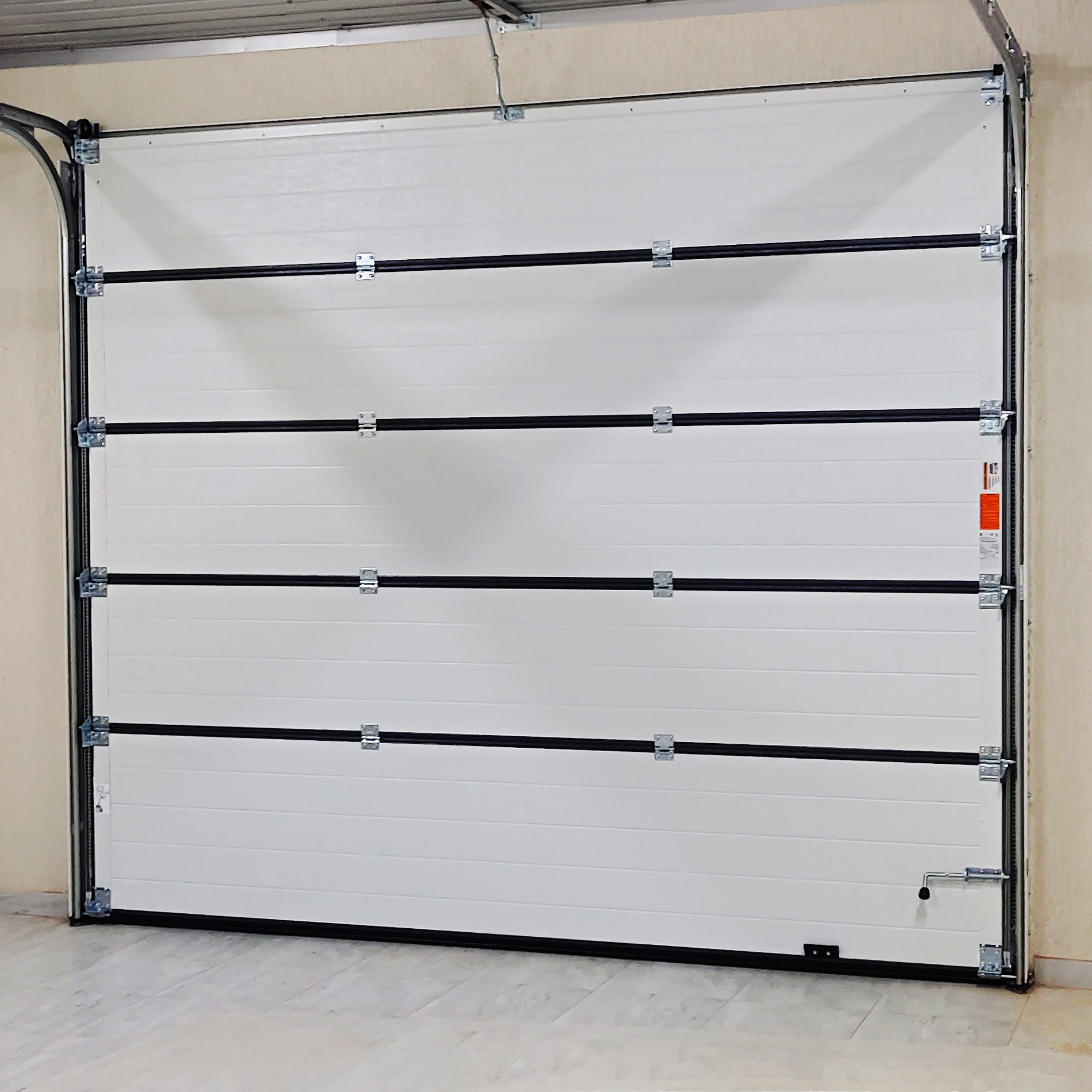 Конструкция премиум-качества. В основе лежит сэндвич-панель толщиной 45 мм. Идеально подходит для эксплуатации в регионах с нестабильным климатом и перепадом температур. Ворота могут выдерживать ураганные порывы ветра – до 120 км/ч. В стандартной комплектации полотно выполнено из нержавеющей стали с защитным слоем ПУР-ПА от выгорания и растрескивания покрытия.